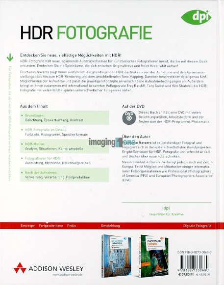 Zurück zur ProduktübersichtAddison-Wesley HDR FotografieStark reduzierter Sonderpreis nur solange Vorrat reicht (ehemaliger Preis 39,80 €). Die High-Dynamic-Range-Fotografie ist nicht nur im technologischen Sinne ein Durchbruch – sie öffnet gleichermaßen neue Wege und Möglichkeiten für den fotografisch-künstlerischen Ausdruck. HDR bietet neue und nahezu unbegrenzte Möglichkeiten. Soll das Bild die pure Realität widerspiegeln oder doch die Phantasie des Fotografen abbilden? Wie das Ergebnis auch ausfallen mag, der visuelle Eindruck wird überwältigend sein. Besonders die nahezu unbegrenzten Möglichkeiten im künstlerischen Bereich macht HDR so attraktiv. In diesem Sinne bietet dieses Buch weit mehr als nur eine Anleitung zur HDR-Fotografie. Es werden jeweils fünf Methoden für die unterschiedlichsten Aufnahmesituationen erläutert. Daneben präsentiert der Autor Arbeiten von fünf international anerkannten Fotografen.HDR-Fotografie richtet sich an ambitionierte Hobbyfotografen und solche, die es werden wollen. Der Autor Fructuoso Navarro wirbt mit einem unglaublichen Erfahrungsschatz und ausgefeilten Techniken. Schritt-für-Schritt erklärt er dem interessierten Fotografen, mit welchen Methoden er zu welchem Ergebnis gelangt.