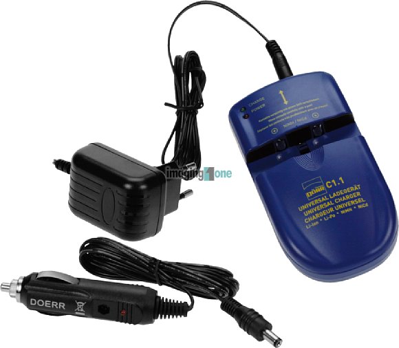 Der kleine Universal-Schnelllader PIXO C1.1 von Dörr lädt alle 3,6-3,7V- und 7,2-7,4V-Lithiumionen-Akkupacks aus Digital- und Videokameras dank seiner patentierten Klemmvorrichtung und Kontaktierung (kleine Ausnahme: Bei Akkupacks mit Kontakten auf gegenüber liegenden Gehäuseseiten funktioniert der C1 leider nicht). Das intelligente kleine Gerät besitzt einen Spezial-Microcontroller zur Steuerung und Überwachung aller Ladevorgänge und ist weltweit, auch im Auto (durch mitgelieferten 12V-Autoadapter), einsetzbar. DArüber hinaus besteht die Möglichkeit 1-2 handelsübliche NiMH-Rundzellen in den Formaten AA (Mignon) oder AAA (Micro) zu laden.