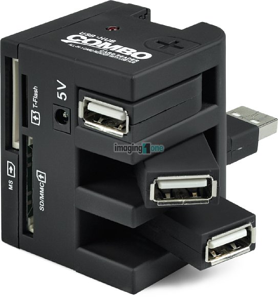 Kompaktes Kartenlesegerät mit integriertem USB-Hub für bis zu drei Geräte. Die USB-Anschlüsse sind drehbar. Sollen Geräte mit erhöhtem Energieverbrauch, wie bspw. Festplatten, angeschlossen werden, besteht die Möglichkeit ein externes Netzteil anzuschliessen. Das Gerät ist Mass-Storage-Class-kompatibel und kommt ohne weitere Treiberinstallation aus.