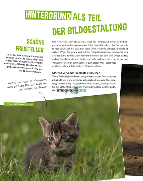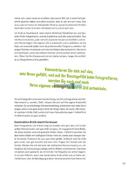 In diesem Buch beschreibt die erfahrende Tierfotografin und Autorin Regine Heuser, wie man die eigenen und auch fremde „Samtpfoten“ gelungen in Szene setzt. Dabei vermittelt die Autorin Wissenswertes, wie man beispielsweise den richtigen Zeitpunkt für eine Aufnahme findet oder eine reizvolle Situation erkennt sowie Lichtsituationen richtig einschätzt und kontrolliert. Zudem ist das Buch reichhaltig illustriert und unterstreicht damit die einzelnen Lektionen optimal. Das Buch ist sowohl als Downloadversion als auch als gedrucktes Buch erhältlich.