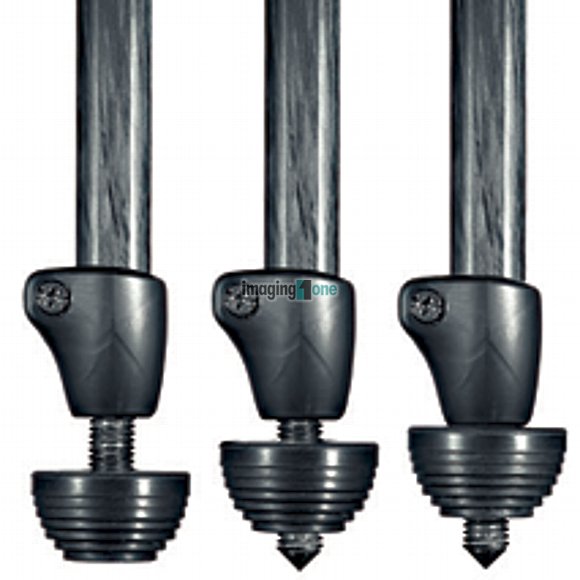Dreier-Set für Stativmodell 190D, 190CL,190PRO und 190MNAT3, deren unteres Beinsegment einen Durchmesser von 19 mm hat. Gummifuß mit herausdrehbarem Erddorn, komplett mit eigenem Befestigungswerkzeug. Der Erddorn wird aus einer speziell gehärteten und korrosionbeständigen Alulegierung gefertigt.