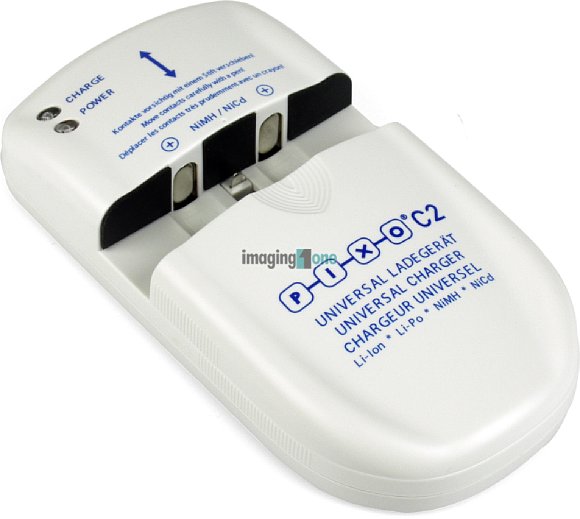 Das kleine Universal-Schnellladegerät PIXO C2+ lädt alle Lithiumionen-Akkus mit einer Spannung von 3.6-3.7 V und 7.2-7.4 V (Ausnahme: Akkus mit Kontakten auf gegenüberliegenden Gehäuseseiten) sowie Mignon(AA)- und Micro(AAA)-Akkus. Außerdem ist ein USB-Anschluss vorhanden, über den durch 10 mitgelieferte Adapter Mobiltelefone von Nokia, Sony Ericsson, Motorola und Samsung geladen werden können. Das Gerät arbeitet vollständig ohne zusätzliche Ladeschalen oder Adapterplatten, die Akkus werden von einer patentierten Klemmvorrichtung gehalten. Die Polarität und Spannung der Akkus wird automatisch erkannt, so sind keine weiteren Einstellarbeiten nötig - Akku einlegen, der Ladevorgang beginnt. Die Vielseitigkeit des C2+ beschränkt sich nicht nur auf die Anzahl der zu ladenden Akkus, dank des mitgelieferten 12 V-Adapters kann das Gerät auch im Auto oder anderen Plätzen mit geeigneter Stromversorgung betrieben werden.